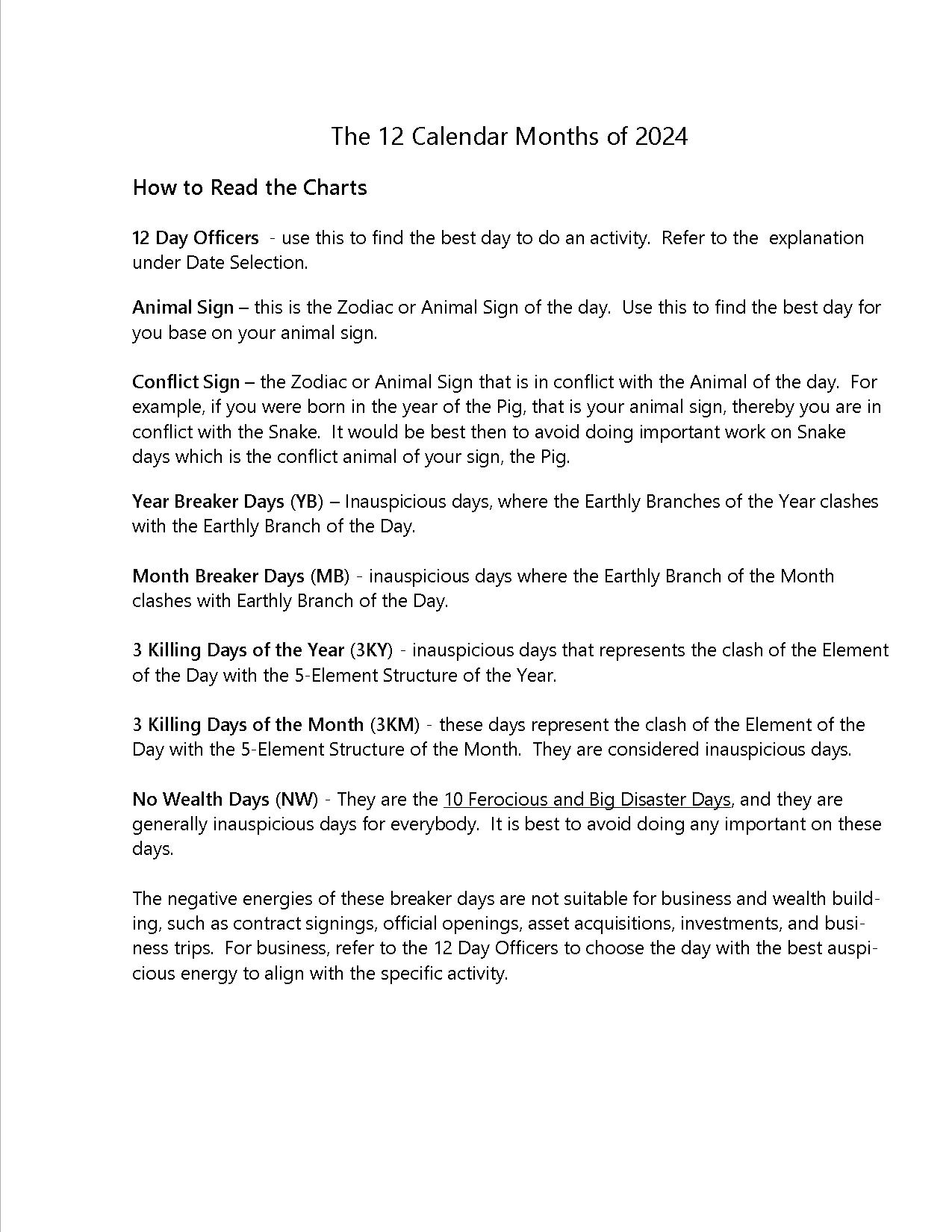 Our easy-to-use monthly calendar will help you analyze the year at a glance and plan all your important work and travel activities around your favourable days and avoid the unfavourable ones. This handy tool will enable you to achieve the best possible level of productivity and success in 2024 the Year of the Green Wood Dragon.